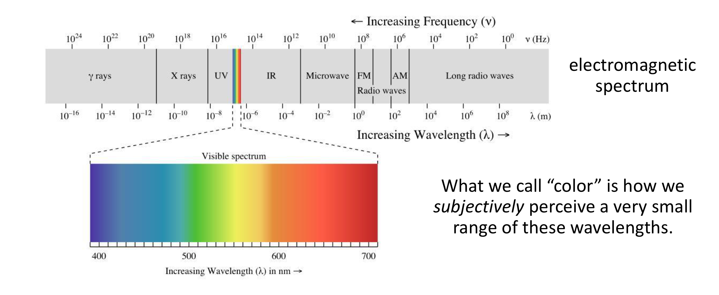 🧑🏻💻용어 정리 Computer vision Color image RGB fullcolor HSV YIQ YUV 지금까지 우리는 Gray Scale의 image들에 대해 다뤘습니다. 이제 Color image processing에 대해 다뤄보죠. Color image processing 실제로 color image가 많이 처리되죠. 지금까지 다룬 흑백은 밝기를 의미하는 것이라고 볼 수 있습니다. 사람은 밝기에 대해 색상처럼 민감하진 않습니다. 사람의 시각은 색상을 잘 구별합니다. 위 사진은 전자기파의 파장에 따른 선을 나타낸 것입니다. 그 중에 사람 눈에 보이는 것이 가시광선 구간입니다. 이렇게 파장에 따라 색이 위와 같이 구분됩니다. 이정도 교양으로 알고 넘어가시면 되겠습니다. 가로축은 파장입니다..
